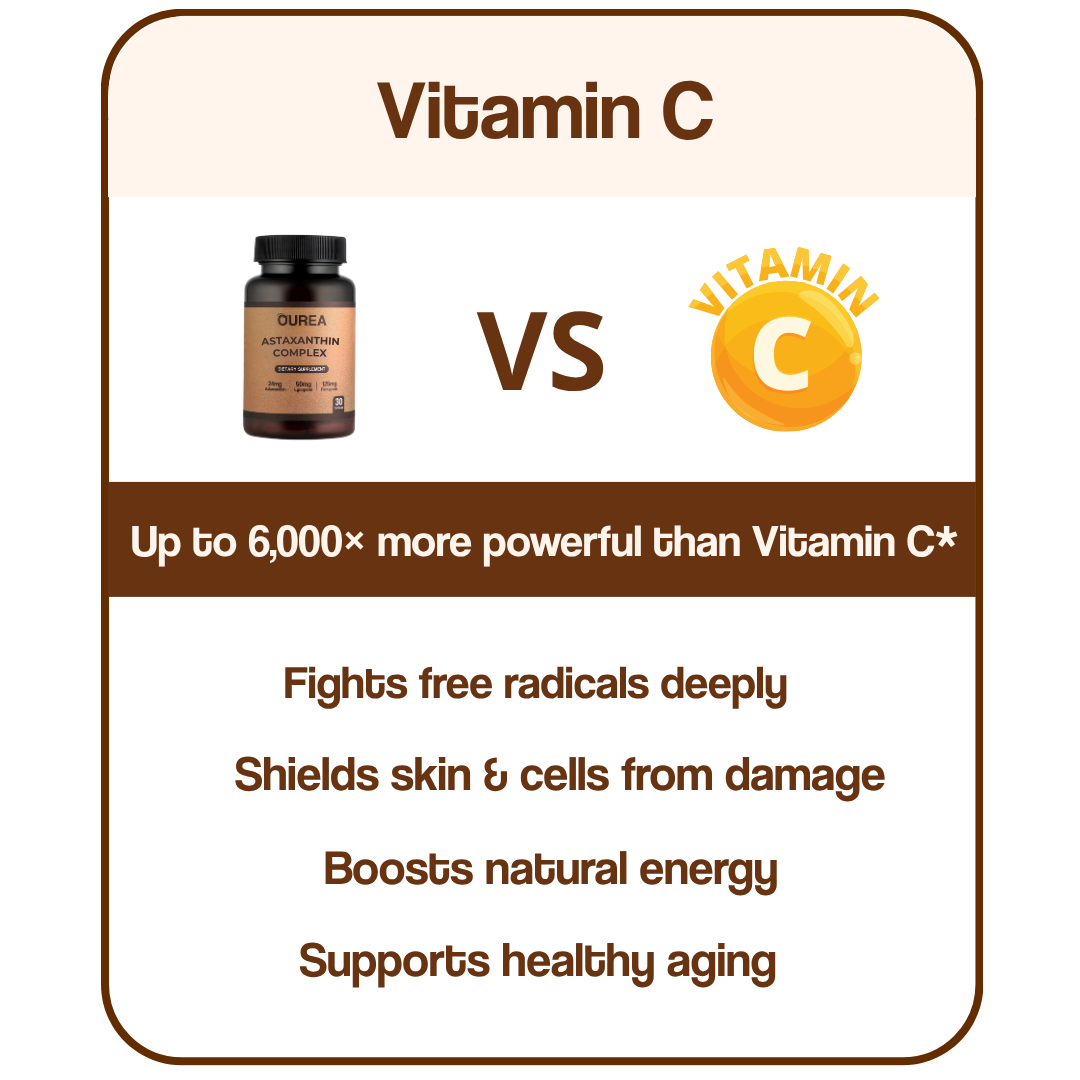 Ourea contains 24mg of pure Astaxanthin — clinically shown to be up to 6,000x stronger than Vitamin C in neutralizing free radicals. It protects your skin, energy, and cells at a level most antioxidants can’t reach.